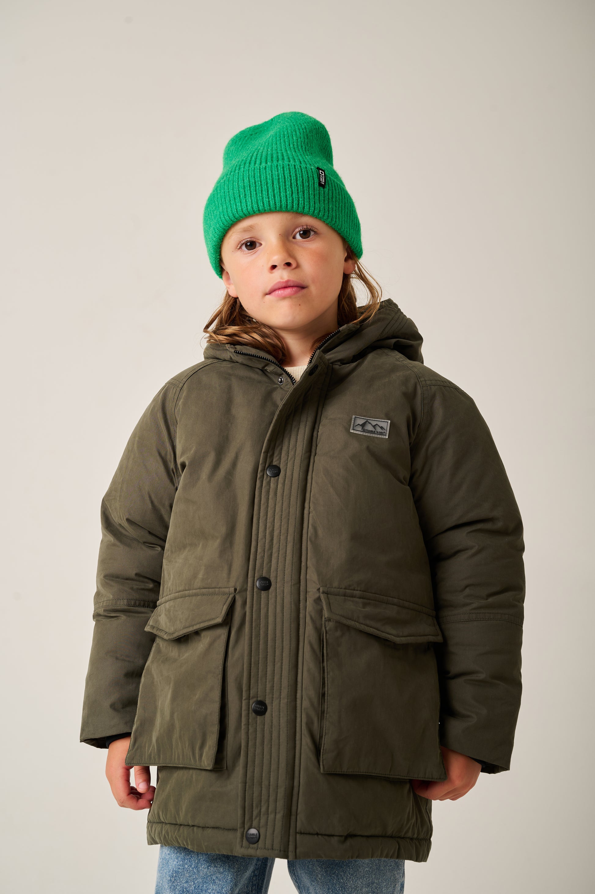 Deze donkergroene, half lange winterjas heeft een handige ritssluiting, een capuchon en een zachte nep bont voering. Verder is de jas voorzien van klepzakken met drukknoopsluiting en heeft deze een binnenzak met klittenbandsluiting en er zitten elastieke boorden onderaan de mouwen. De winterjas is gemaakt van Recycled polyester, heeft een vulling van Sorona en een bionic eco finish. Ons model is 128 centimeter lang en draagt maat 128.