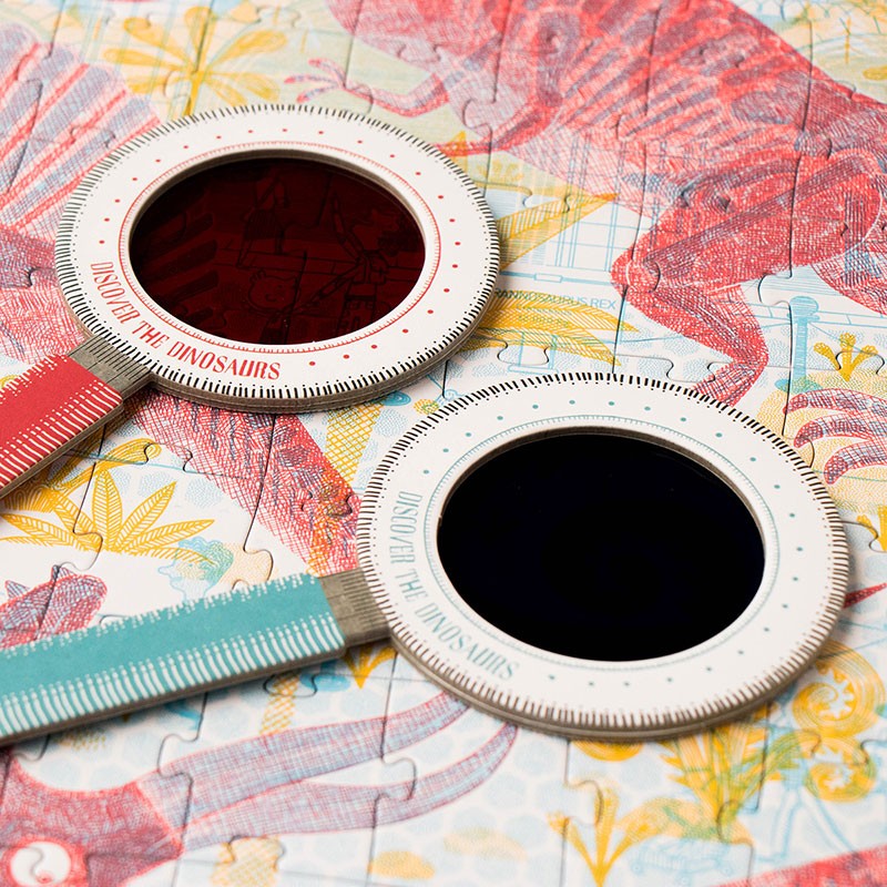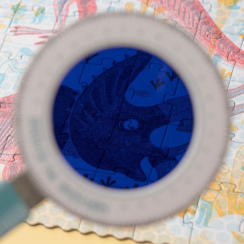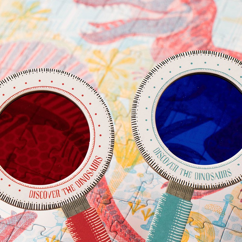 Een zeer originele puzzel, met het rode vergrootglas reist u naar het Jura-tijdperk en met het blauwe vergrootglas ontdekt u het museum.