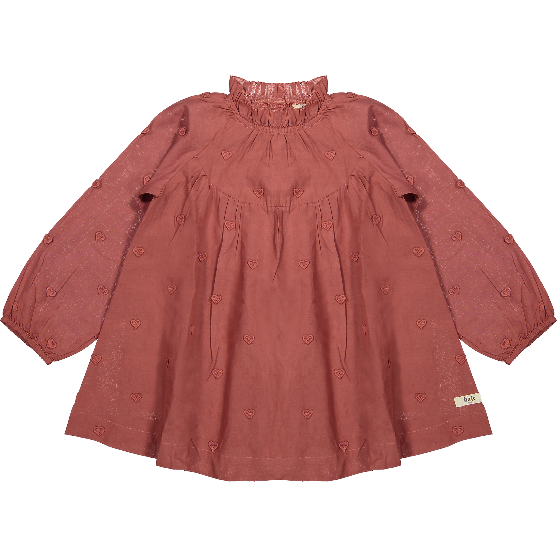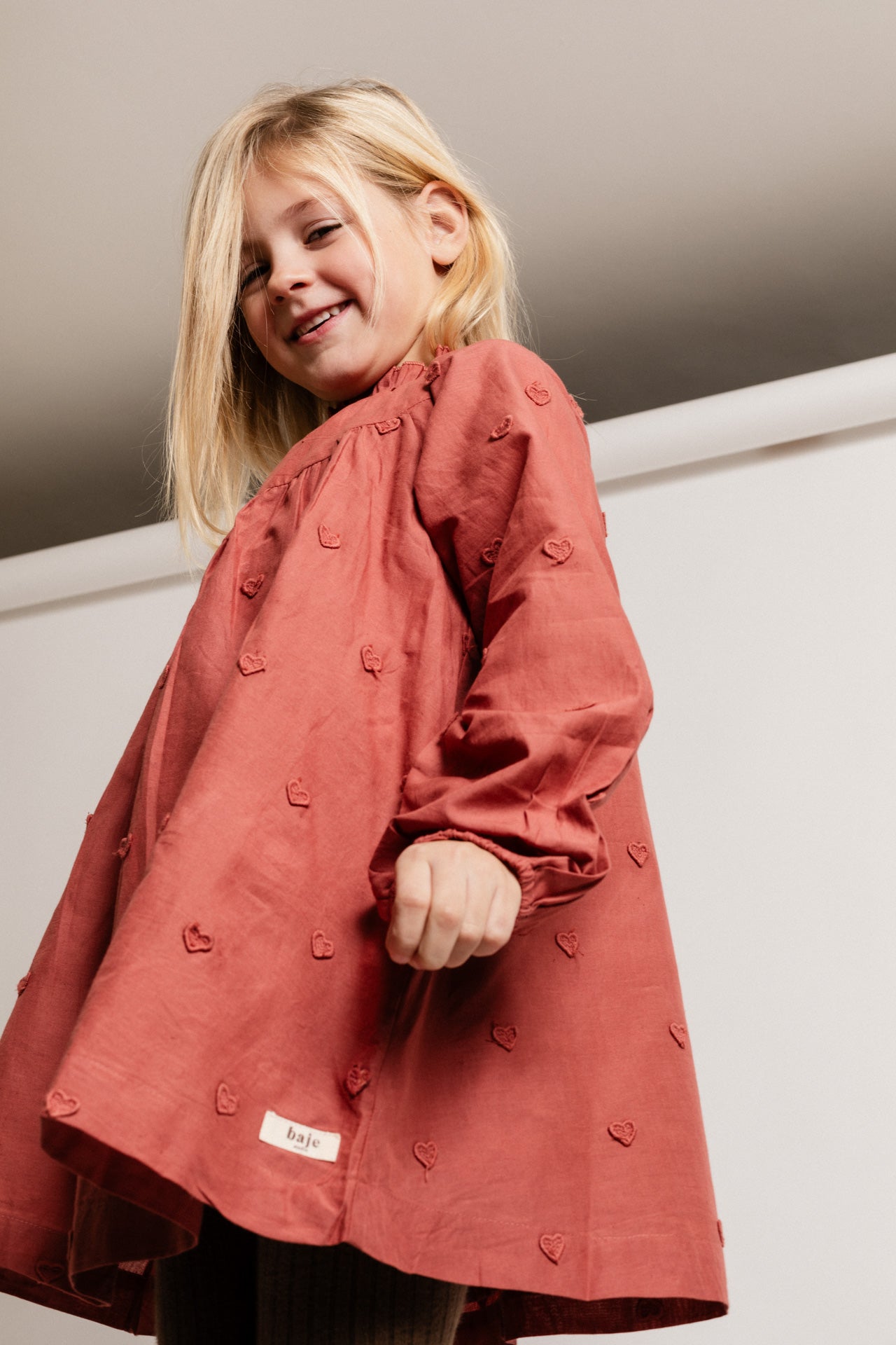 De Lajoux jurk van Baje Studio is de ultieme mix van eenvoud en verfijning. Gemaakt van zacht geweven katoen en versierd met subtiele hartjes, straalt deze jurk een speelse charme uit. De diepe rode kleur maakt het een echte eyecatcher, perfect voor zowel feestelijke gelegenheden als voor dagelijks gebruik. De ronde halslijn met een fijne ruffle en de licht gepofte mouwen geven de jurk een klassieke uitstraling. De losse pasvorm zorgt ervoor dat je meisje vrij kan bewegen en zich de hele dag comfortabel voelt. Combineer de jurk eenvoudig met een maillot en laarsjes voor een warme winterlook.