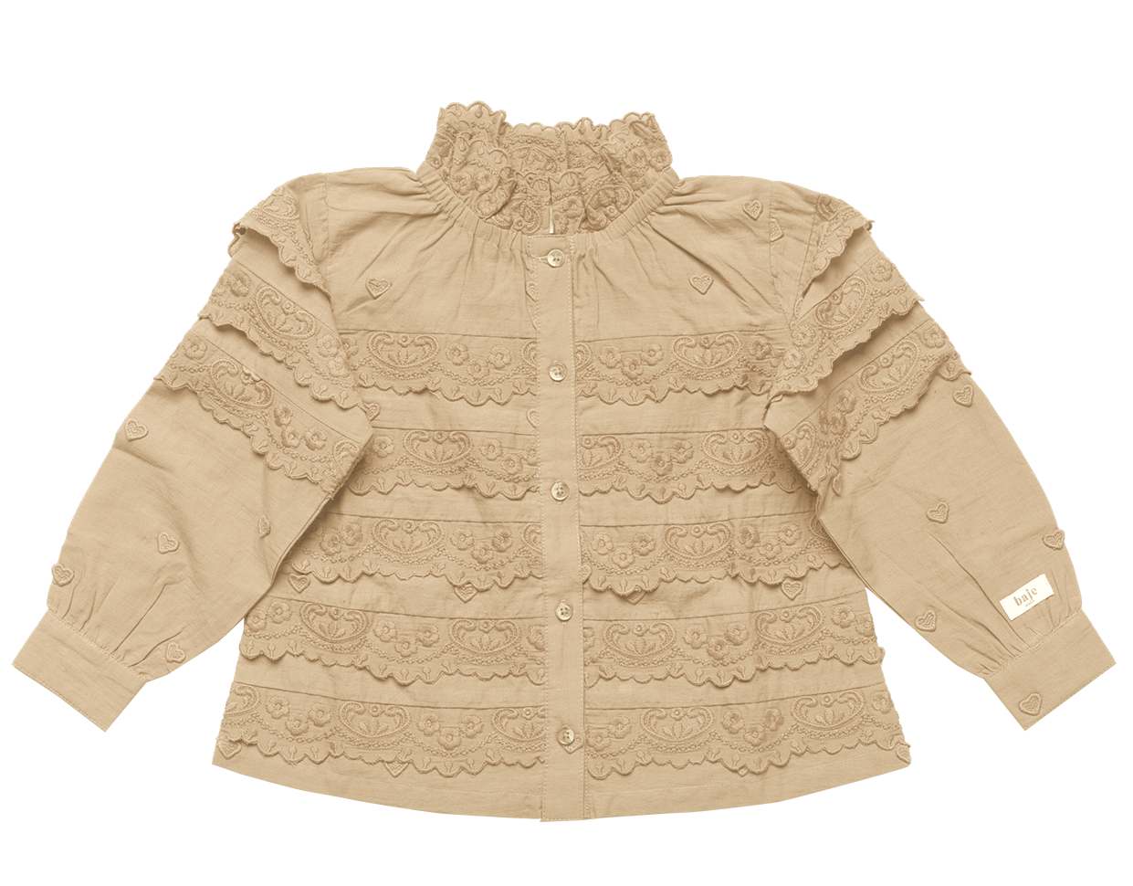 Deze stijlvolle meisjes blouse met lange mouwen is een echte eyecatcher. De blouse is uitgevoerd in een zachte zandkleur en voorzien van prachtige borduurdetails en hartjesmotiefjes. De rijen met geborduurde stroken en de hoge hals met ruches geven de blouse een romantische, maar toch speelse uitstraling.