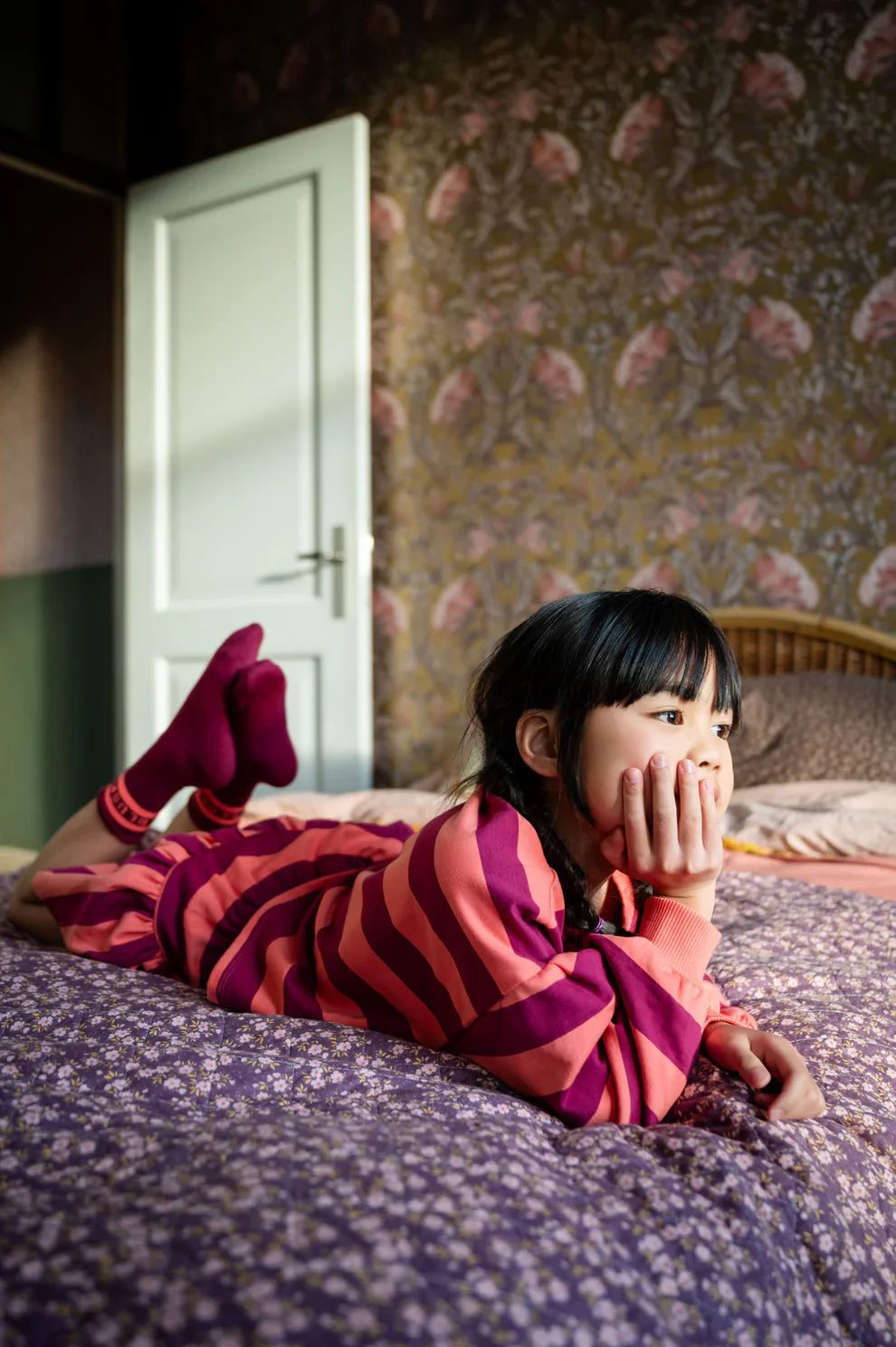 De Ruffle Skirt Stripe in Peach/Beaujolais heeft een vrolijk gestreept design in warme perzik- en wijnrode tinten. Gemaakt van zachte, soepele stof met een comfortabele elastische tailleband. De ruffle aan de onderkant geeft de rok een speels detail.
