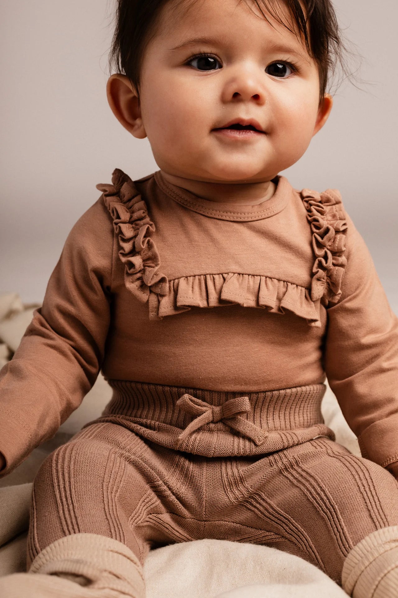Baby legging Soral – peach – Baje Studio De Soral legging van Baje Studio is een comfortabele gebreide rib legging die elke baby outfit compleet maakt. Gemaakt van heerlijk zacht katoen, waardoor je kleintje zich de hele dag vrij kan bewegen. De elastische tailleband met schattig strikdetail zorgt voor een perfecte pasvorm en extra draagcomfort. De peachkleurige tint geeft een lieve en stijlvolle uitstraling en is gemakkelijk te combineren met een romper, trui of jurkje uit dezelfde collectie.