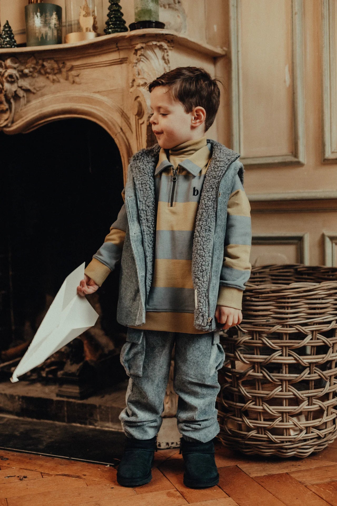 De Wez rib cargo broek van Baje Studio is dé perfecte combinatie van comfort en stoere stijl. Gemaakt van zachte ribstof voelt de broek warm en flexibel aan, terwijl de cargo zakken zorgen voor een trendy en speelse look. De elastische tailleband en boorden maken dat de broek altijd goed aansluit en heerlijk zit, ideaal voor actieve kinderen. Dankzij de neutrale kleuren grijs en groen is deze broek makkelijk te combineren met truien, hoodies en vesten uit de Baje Studio collectie.